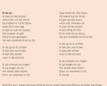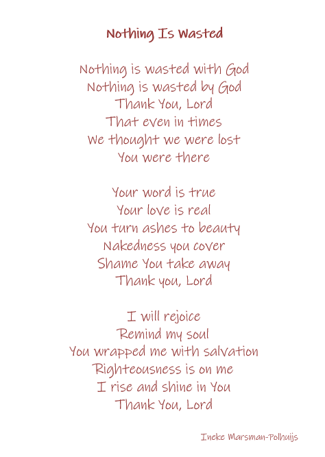 Ik weet dat het waar is. Dat God er altijd is. Dat Hij me door het diepe dal van de dood zal leiden. Dat er een moment zal komen dat ik in staat ben om te zeggen dat Hij mijn rouw in reidans heeft veranderd. Is het niet nu, dan zeker straks als ik in de hemel kom. Ik weet dat op de momenten waarop ik Hem niet voel, en het verdriet allesoverheersend is, als een mist waar je niet doorheen kunt kijken, dat op die momenten Hij er toch nog steeds is. En dat Hij me zelfs draagt, zoals dat staat in dat mooie gedichtje over voetstappen in het zand.