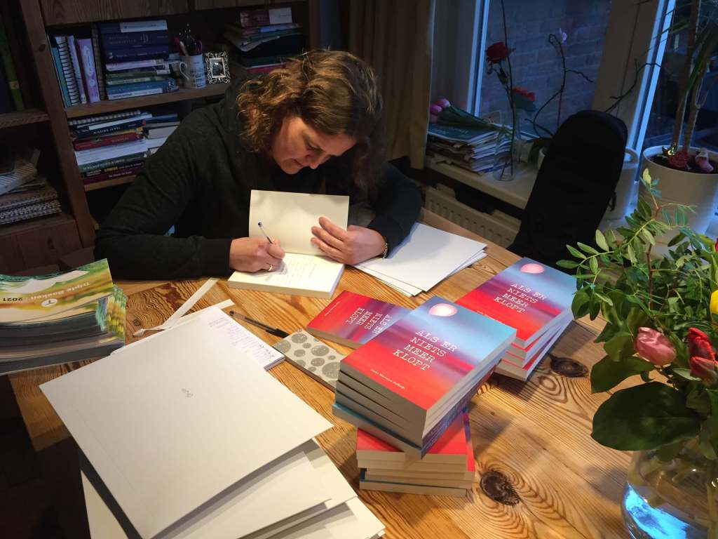 Ik heb alle emotionele kracht die in mij is nodig om dit project te doen. Om de enige foto’s die er van haar zijn een plek te geven. De tranen stromen over mijn wangen terwijl ik de momenten opnieuw beleef die de foto’s laten zien. Hoe het was toen ze ter wereld kwam. Hoe we haar voor het eerst ontmoetten. Hoe we thuis kwamen en haar aan de kinderen lieten zien en aan onze ouders, zussen en aan mijn beste vriendinnen. Hoe we steeds even bij haar zaten toen ze in haar wiegje lag. En hoe we haar die maandag in haar mandje legden, de deksel sloten en meenamen naar de begraafplaats. De enige rit die we maakten met zijn zevenen.