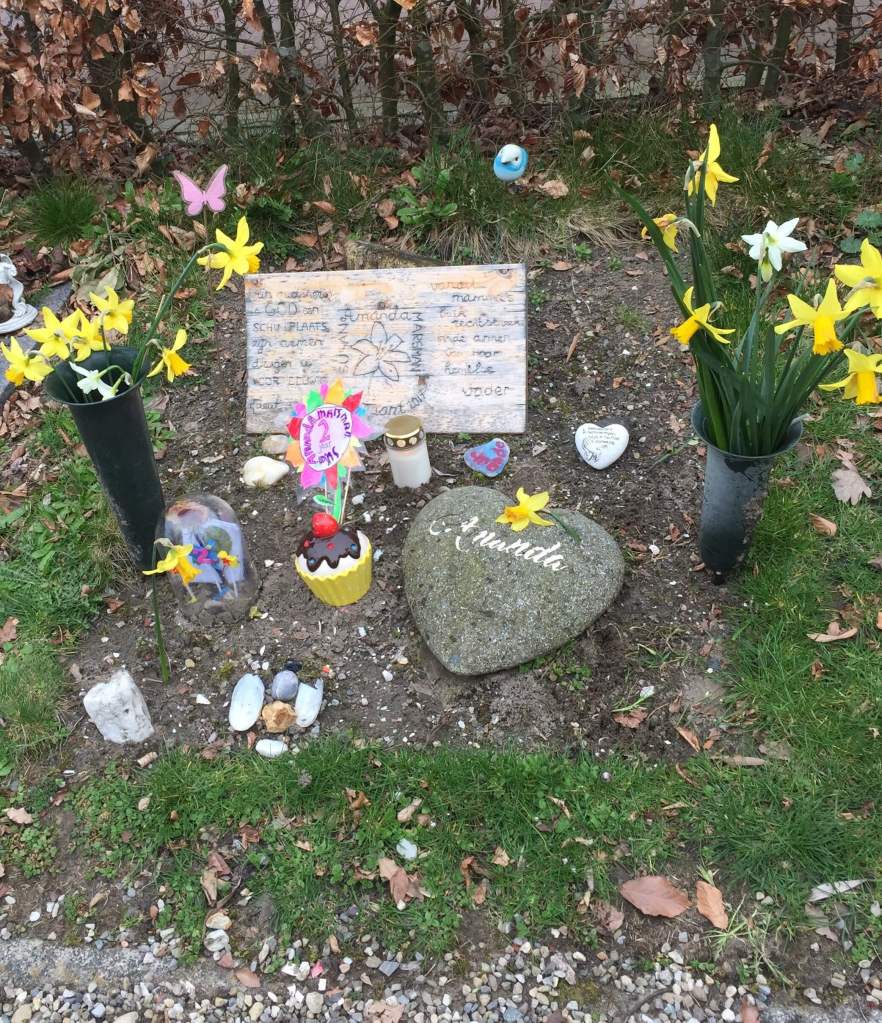 En dan de wandeling naar het grafje. Mijn man die met een trapje het graf inging, het mandje met ons dochtertje erin van me overnam en voorzichtig neerzette in dat diepe gat. Zijn ogen vol verdriet en weerzin. Hoe hij er weer uitklom en we elkaar in de armen vielen. De wanhoop, de scherpe pijn, het immense verdriet. Nu ik dit type word ik opnieuw misselijk en ik herinner me weer hoe ik een paar weken nadien moest vechten tegen de drang om mijn kind weer op te graven. Bizar. Mijn verstand weet ook wel dat dat iets is wat je niet zou moeten doen, niet zou moeten willen.