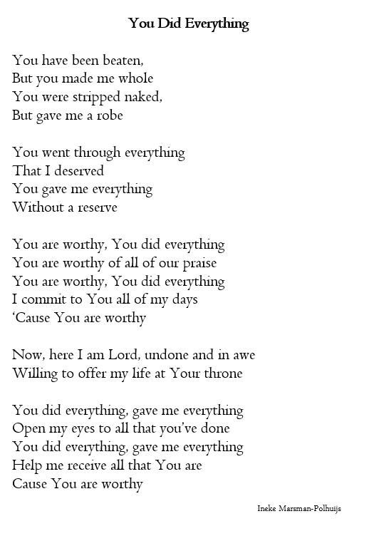 Gisteren speelde en zong ik in de kerk. Ik vind dat heerlijk om te doen, maar met sommige liedjes heb ik het moeilijk. Zoals ‘Good, good Father’ dat we deze keer zongen. Ik vind dat een mooi, maar pijnlijk lied, zeker sinds Amanda overleden is.